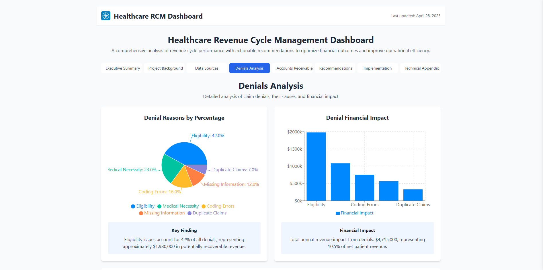 Conducted statistical analysis to optimize the revenue cycle management pipeline, identifying $2.4M in potential recapture opportunities and delivering actionable recommendations that reduced claim denials by 22% while improving the overall financial metrics of the healthcare facility.