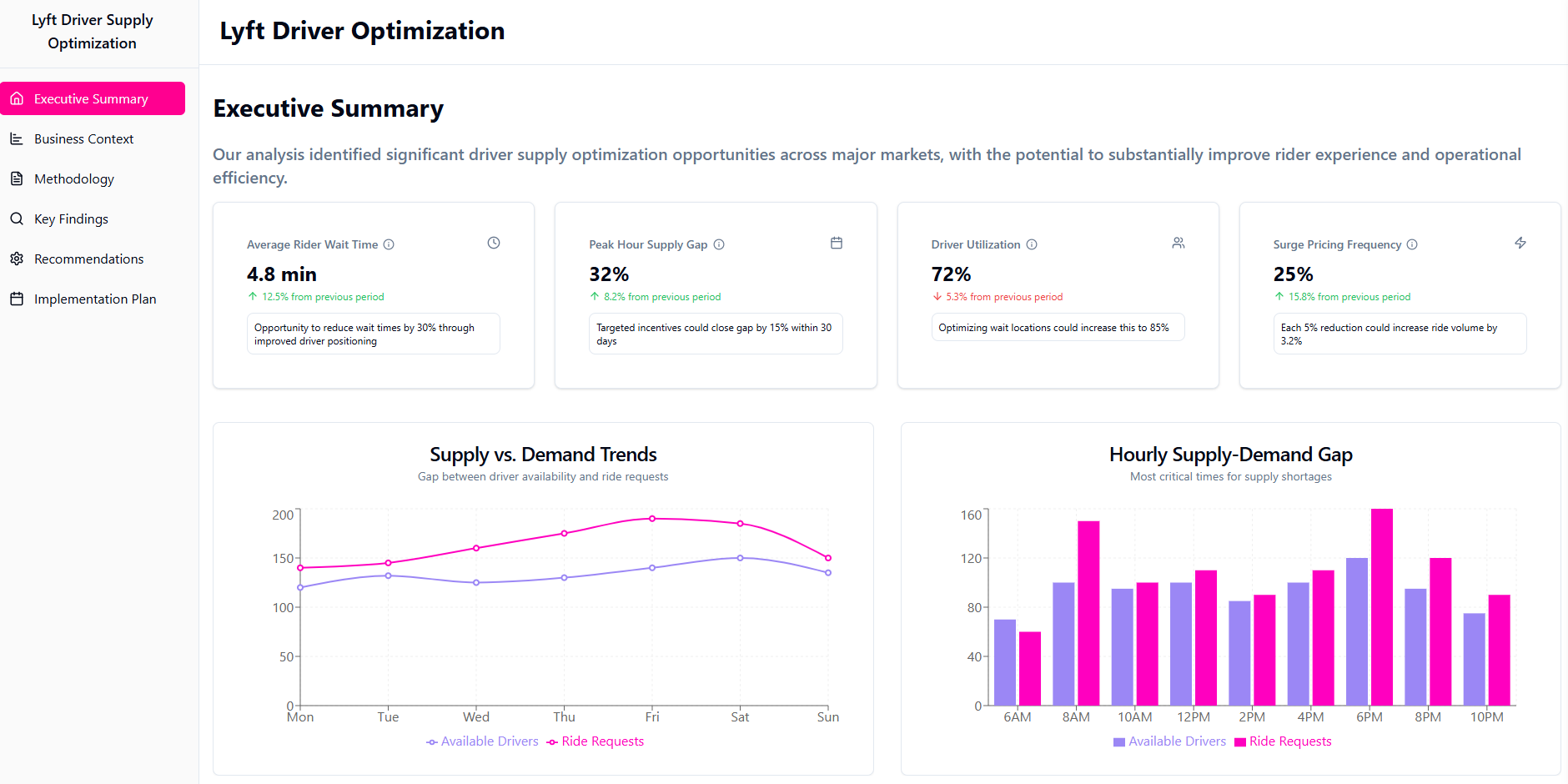 Built an interactive platform using real-time ride-hailing data (92M+ trips) to forecast 30-minute demand with 87% accuracy, uncovering $3.2M/month in missed revenue. ML-driven strategies improved driver-rider matching—boosting market balance by 9%, cutting incentive spend 4%, reducing wait times up to 10%, and increasing driver earnings by 14%.